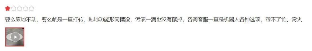 比如,在某扫地机产品的评价中,有消费者指出,“清洁不干净,容易打飞大颗粒,退货啦”,“没用多久就出现问题。没用一分钟说尘盒满了,其实尘盒很干净”,“要么原地不动,要么就是一直打转,拖地功能形同摆设,污渍一滴也没有擦掉,咨询客服一直是机器人各种选项,帮不了忙,窝火”……