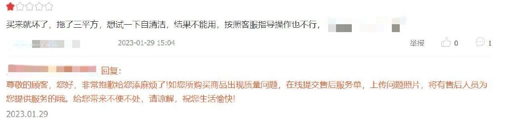 在某洗地机产品的评价中,有消费者指出,“拖地不干净,瓜子皮都吸不起来,价格高不值”,“用了没几次滚刷风干就不出风了语音也没有了”,“电池不经用,而且漏水”,“买来就坏了,拖了三平方,想试一下自清洁,结果不能用,按照客服指导操作也不行”……